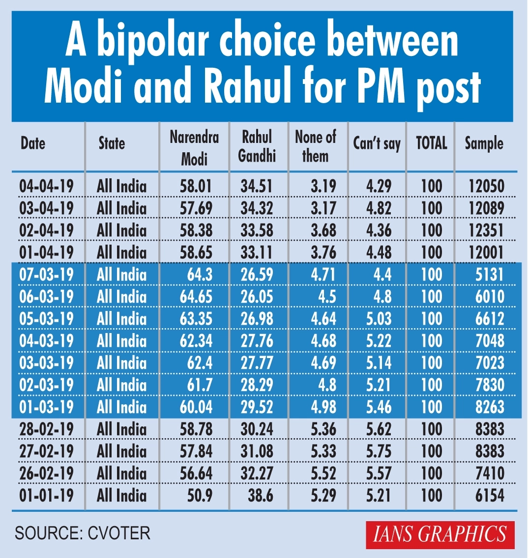 "When we presented the respondents with a binary choice between Rahul Gandhi and Narendra Modi for PM's post, the results were similar. Rahul Gandhi was asserted as the PM choice by a record 38 per cent respondents on January 1, 2019, ever since he has declined to 34.5 per cent. PM Modi's approval on the other hand has risen from 51 per cent to 58 per cent. The differential in net approval ratings has been even more stark, from a relatively thin margin of 12 per cent it has now soared to 23 per cvent in favor of PM Modi," the survey said.