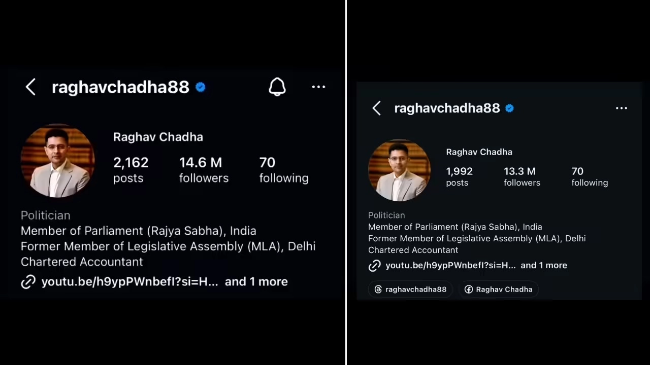 Aam Aadmi Party (AAP) leader-turned-Bharatiya Janata Party (BJP) member Raghav Chadha has witnessed a sharp decline in his social media following shortly after his political shift, with reports indicating a significant drop in Instagram followers within 24 hours of joining the BJP. The development has drawn attention amid wider political reactions to his exit from AAP. According to available data, Chadha lost nearly one million followers on Instagram within a day of announcing his move to the BJP. His follower count reportedly fell from around 14.6 million to nearly 13.5 million during this period.