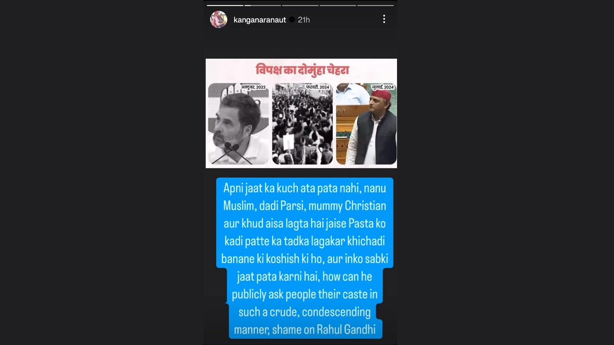 Kangana took to Instagram to share an old video of Rahul Gandhi discussing caste, accompanied by a sharp critique. She wrote, “Apni jaat ka kuch ata pata nahi, nanu Muslim, dadi Parsi, mummy Christian aur khud aisa lagta hai jaise Pasta ko kadi patte ka tadka lagakar kichadi banane ki koshish ki ho, aur inko sabki jaat pata karni hai.” (You know nothing of your own caste, your grandfather is Muslim, grandmother Parsi, mummy Christian and it feels like someone tempered pasta with curry leaves to make rice and lentils, but he wants to know everyone’s caste.) ‘Rahul Gandhi Should Undergo Drug Test,’ Says BJP MP Kangana Ranaut (Watch Video).