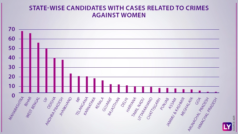 Maharashtra leads the list of candidates with declared cases of crimes against women. The state tops the chart with 65 candidates, followed by Bihar at 62 and West Bengal with 52 candidates. They were given the ticket, despite having criminal cases against women in their affidavits.
