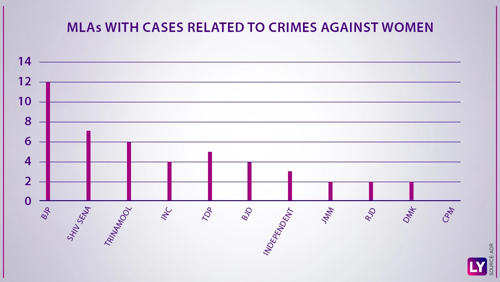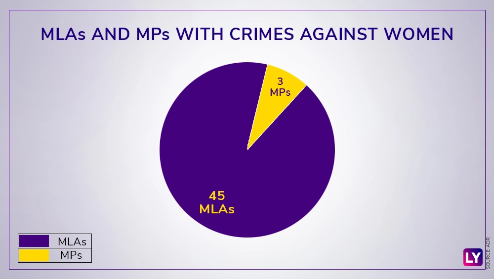 In total, 48 MLAs and MPs in India have declared cases of crimes against women. These crimes include charges related to assault or criminal force to women to outrage her modesty (IPC Section- 354); kidnapping, abducting or inducting women to compel her marriage, etc. (IPC Section- 366); rape (IPC Section- 376); husband or relative of husband of a woman subjecting her to cruelty (IPC Section- 498A); buying minor for purpose of prostitution (IPC Section- 373); and word, gesture or act intended to insult the modesty of a woman (IPC Section-509).