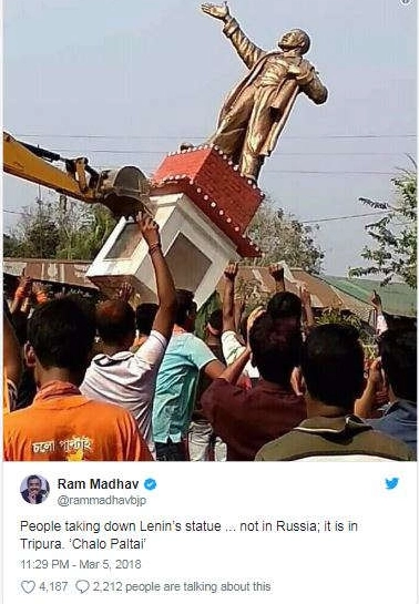 According to News18.com, a photo of the incident was shared by BJP national general secretary Ram Madhav on Twitter and instead of condemning the act, he voiced his support towards it, however, the tweet was later deleted. In a report published in The Hindu, BJP had earlier claimed that their win will mark the end for Communist figures such as Karl Marx and Lenin in Agartala and other parts of the state.
