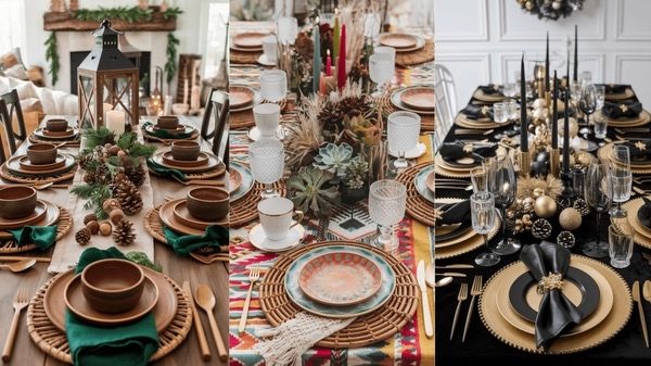For a more eclectic and artistic approach to holiday decor, consider a bohemian Christmas table setting. Use a colourful patterned tablecloth or runner and mix and match plates, cups, and glassware for a relaxed yet vibrant feel. Incorporate natural elements like woven placemats, macramé napkin rings, and rattan chargers. The centrepiece can feature a mix of succulents, dried flowers, and colourful candles. Don’t be afraid to experiment with a non-traditional colour palette, such as rich jewel tones or earthy shades.