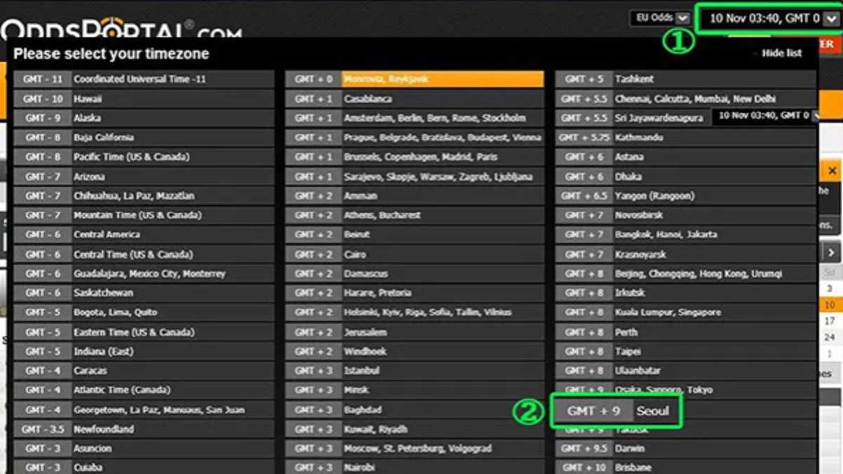 필수적인 것은 그 옆에 있는 시간 설정입니다. 위 이미지 설명과 같이 1번을 클릭해 2번에 있는 GMT+9 Seoul로 체크하시면 경기들이 한국 시간대로 세팅됩니다.