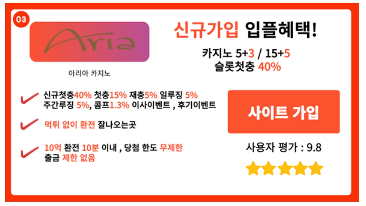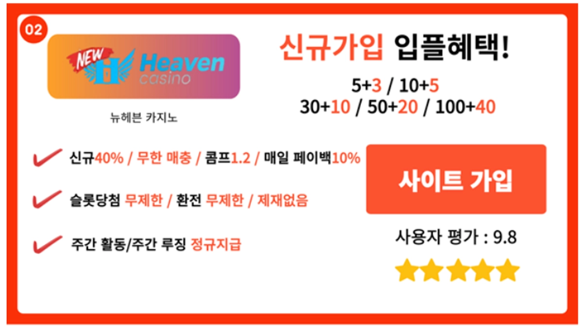 가입 보너스 및 추가 입금 보너스 혜택이 가장 풍부하며, 정기적인 프로모션으로 사용자들에게 높은 만족도를 제공합니다. 혜택 중심의 메이저 사이트로 평가받고 있습니다.