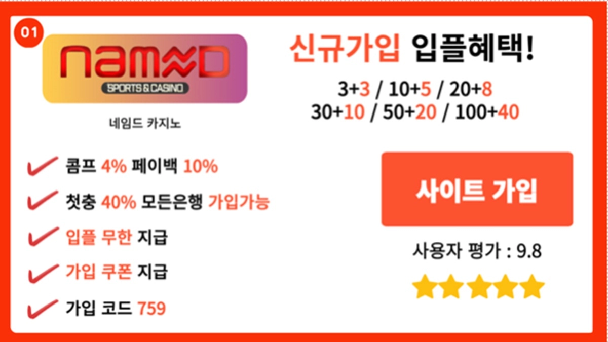 추천 이유: 네임드는 스포츠 및 카지노 분야에서 국내 최대 규모를 자랑하는 사이트로, 입출금이 빠르고 안정적인 것이 가장 큰 장점입니다. 또한 다양한 무한 매충 보너스와 스코어 맞추기 이벤트 등 다양한 프로모션을 제공하여 이용자들에게 높은 혜택을 제공합니다. 가상화폐(테더) 입출금이 가능해 더욱 편리하게 이용할 수 있으며, 최근 사이트 리뉴얼을 통해 한층 더 업그레이드된 서비스가 제공됩니다.