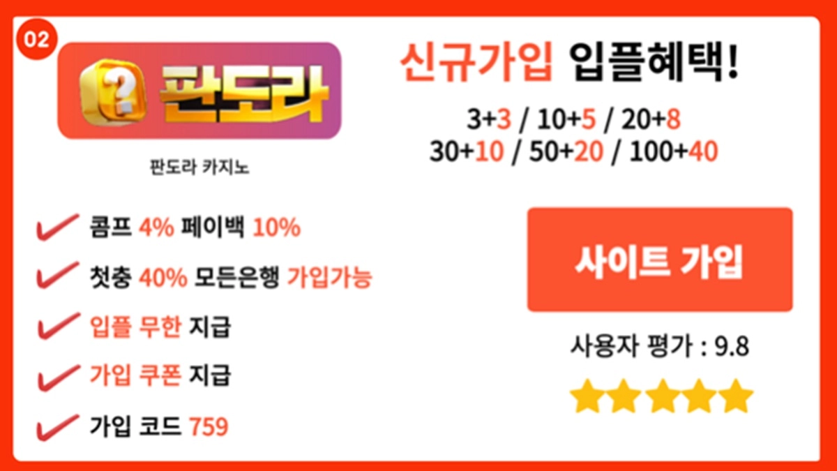 추천 이유: 판도라는 높은 배당률과 메이저사이트 보증업체(슈어맨, 먹튀폴리스)로 인증된 신뢰할 수 있는 사이트입니다. E스포츠 베팅도 지원하여 다양한 스포츠 및 게임에 베팅할 수 있으며, 높은 배당률 덕분에 이용자들이 더 높은 수익을 기대할 수 있습니다.