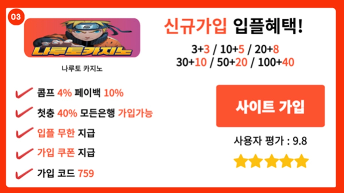 추천 이유: 나루토는 업계에서 가장 빠른 입출금 속도를 자랑하는 사이트로, 베팅 후 곧바로 정산이 이루어지기 때문에 신속한 거래가 가능합니다. 또한, 콤프 포인트를 무제한 지급하여 장기적으로 이용할수록 더 많은 혜택을 받을 수 있습니다.