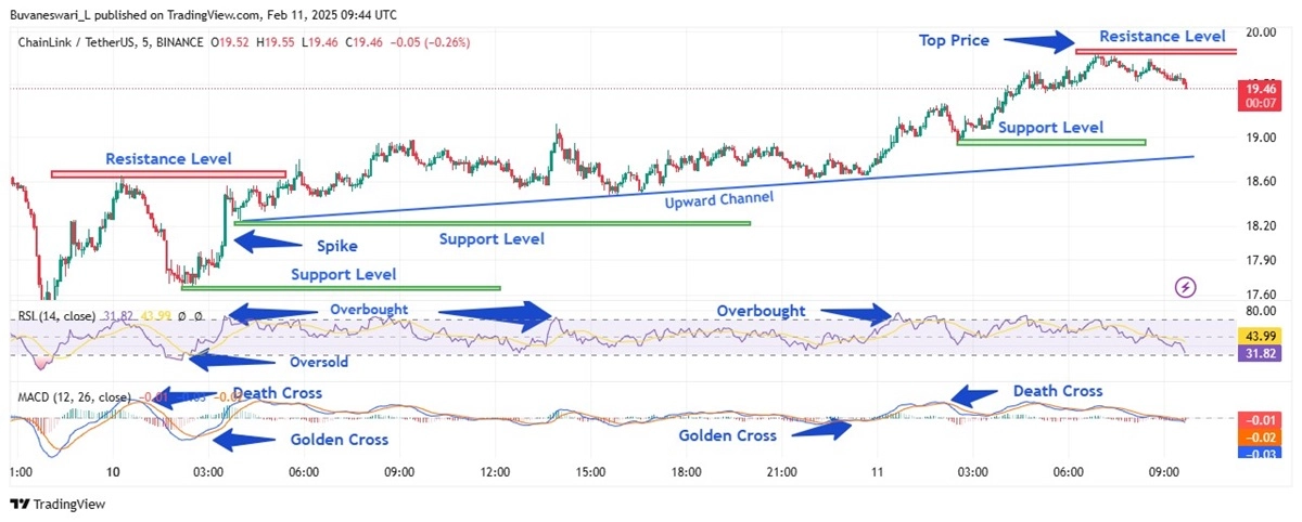 As illustrated in Chart 1, on February 10, 2025, the trading day initiated with Chainlink exhibited a notable price fluctuation and started with a short-term rise. At UTC 00:25, a pin bar performed as a signal bar, followed by a full-body red key bar, signaled a sharp decline in price. A Death Cross on MACD at UTC 00:55 reaffirmed this downfall. This price then found support at $17.65, spiked to $18.54, and experienced an upward channel. A Golden Cross at UTC 02:35 confirmed this uptrend. As the Chainlink's price movement fluctuated, at UTC 23:30, another Golden Cross was encountered on the MACD, signaling a strong bullish momentum.