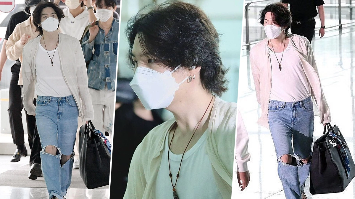 Airport Chic: Suga's airport style deserves special mention. One of his best looks features a stylish shirt over a white tee, ripped blue jeans, a long black necklace, and, of course, his signature mask and sexy hairstyle. BTS' Suga effortlessly leads his fellow BTS members with his impeccable style, leaving everyone speechless.