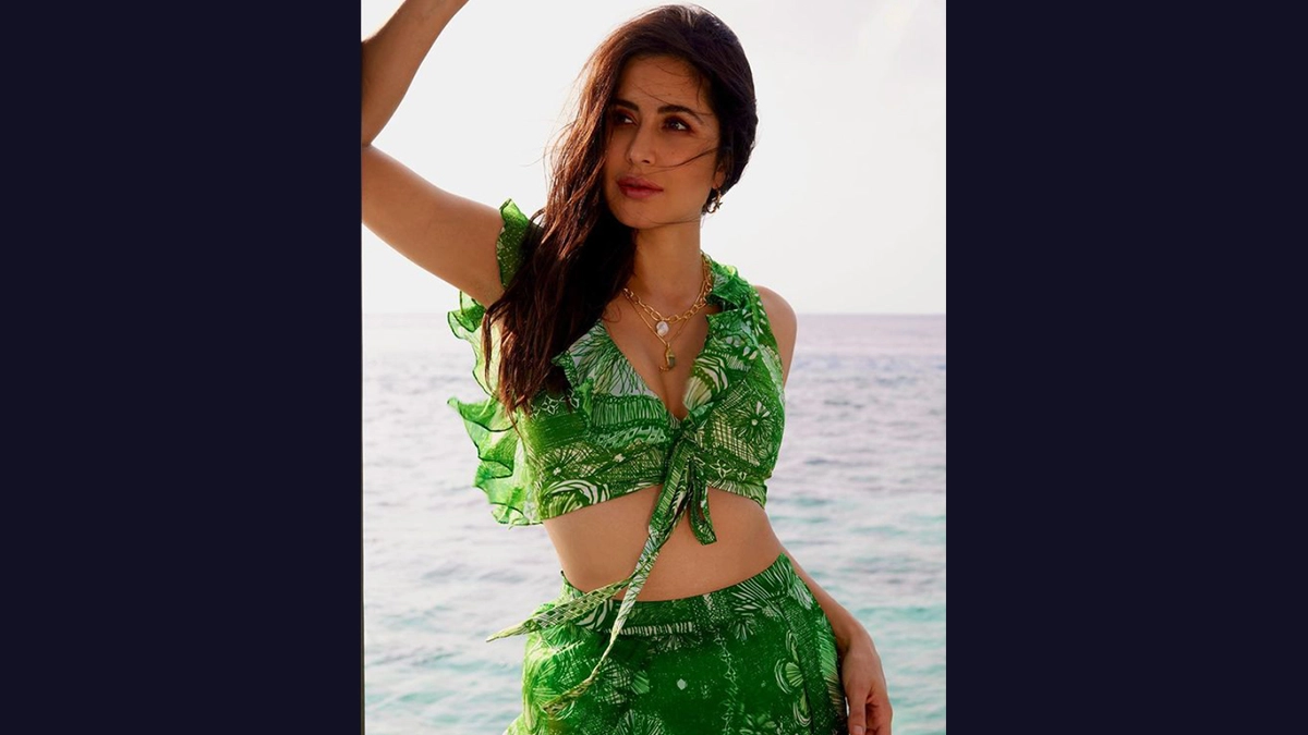 Katrina's emerald green co-ord outfit is comfortable and functional in every way. A midriff-baring tie-up crop top with a V-neckline and ruffled trims at the border completes the summer look. The high-waisted skirt with a front slit goes well with the top.