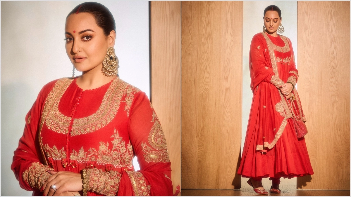If you love bright colours, a red gold embroidered classic salwar set, like Sonakshi Sinha can be a perfect choice for the festivity. The choice of colour is also perfect for puja and rituals.