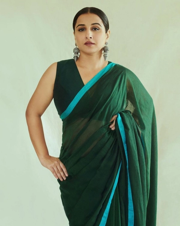 Vidya Balan is known for her love of sarees and ability to carry them with unmatched grace. Her green saree look is no exception. Vidya chose a deep green mul cotton saree with a blue border, creating a simple and elegant appearance. The actress paired her saree with a statement traditional silver earring, enhancing the overall look. This ensemble is ideal for those who want to make a sophisticated and bold statement during Hariyali Teej.