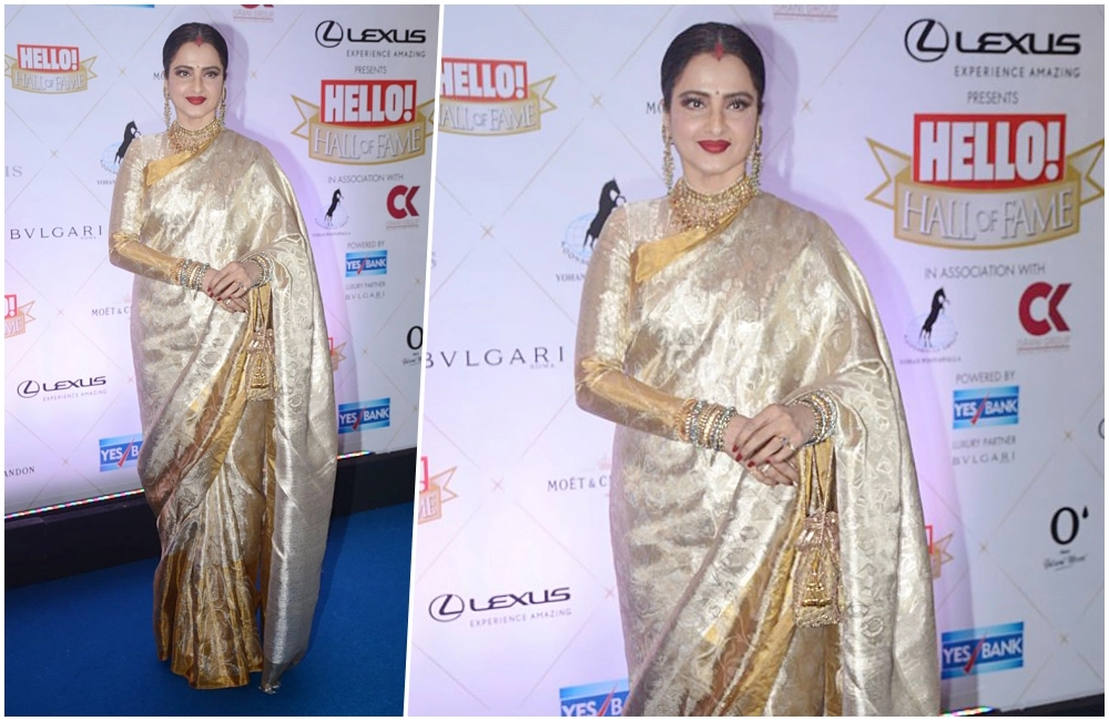 Who other than the legendary actress Rekha can rock a saree in the most glamourous way? The evergreen and beautiful Rekha was seen sporting her signature golden Benarasi silk saree. The actress adorned herself with jewellery with sleeked back hair and made a classy statement with her red lips.