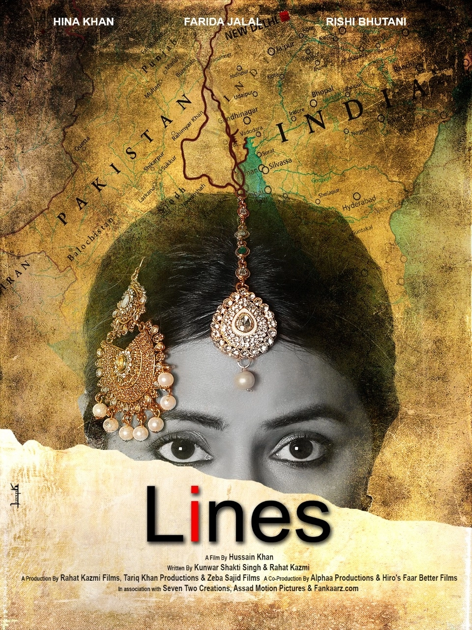 The poster of Lines shows Hina's face with maps of India and Pakistan in the background, gives away the theme of the film. "Lines" depicts the story of a strong young woman portrayed by Hina living on the country's border (LoC) with special emphasis on her struggle and problems of daily life.