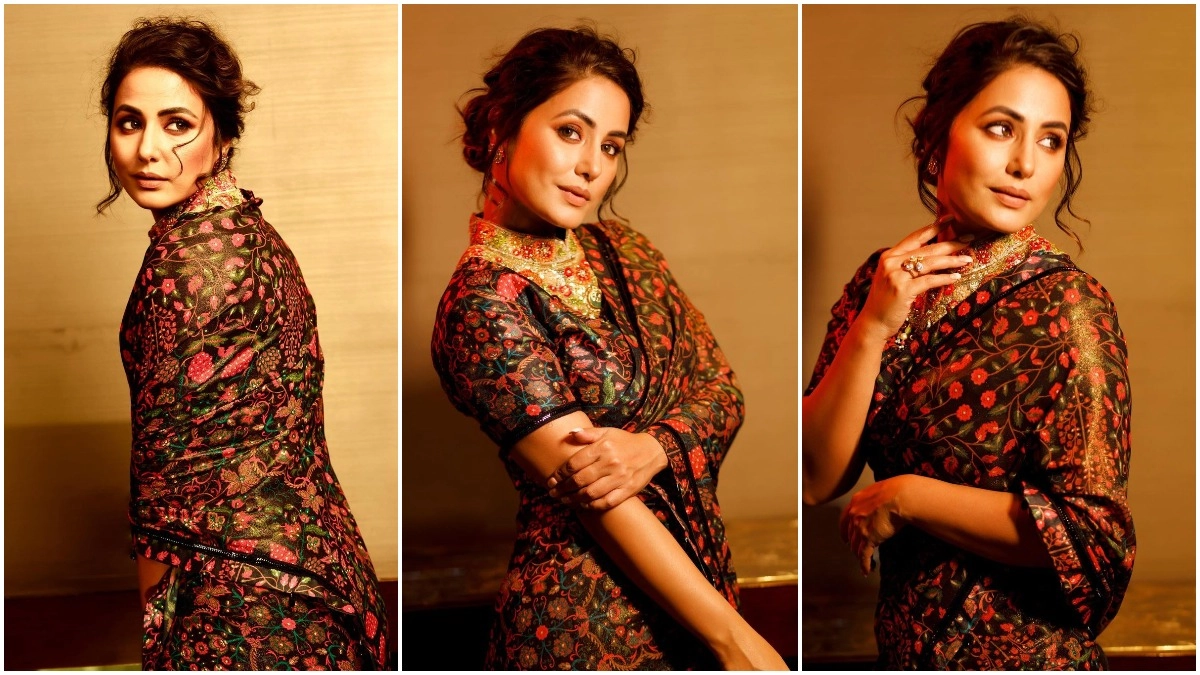 Hina Khan took to her Instagram account to share pictures in her new saree. The saree isn't very typical and the print all over it makes it look beautiful. Hina styled her outfit in a rather contemporary way with a messy hairdo and statement jewellery to go with. Highlighted cheeks, nude lips, well-defined brows and curled eyelashes completed her look further. If she wasn't an actress, Hina could have been a fashion blogger for her taste is supreme and just right! Fashion Faceoff: Hina Khan or Mira Rajput, Whose Royal Purple Lehenga Has Your Vote?