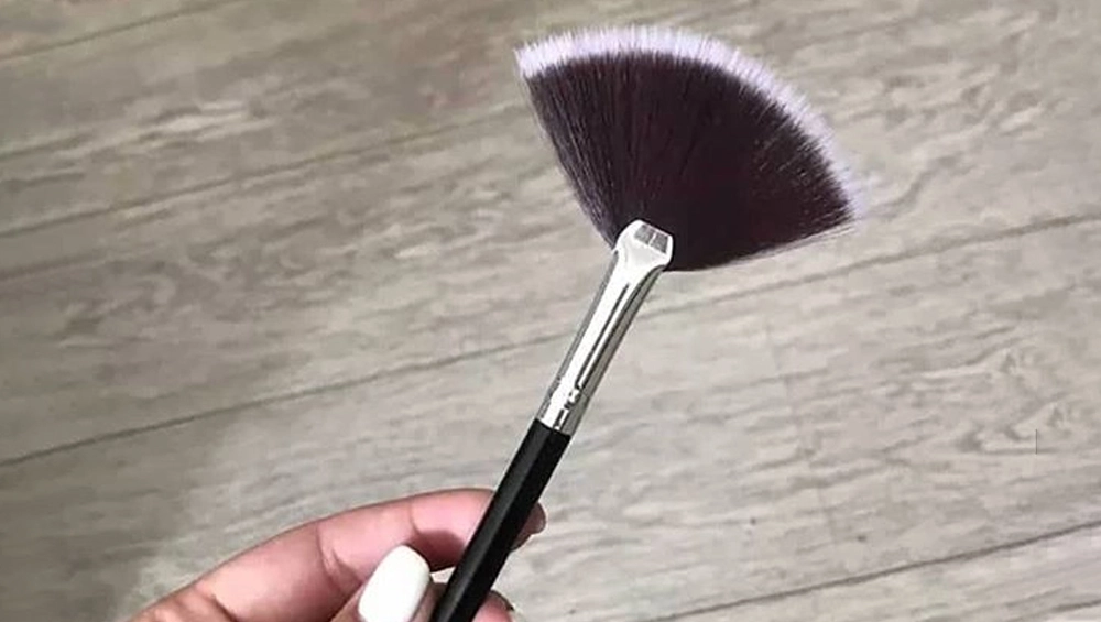 A fan brush is used mostly for highlighter as it gets the highest points of the face, without distributing the product all over the face. These can also be used for very strong and pigmented blush as they give a soft look.