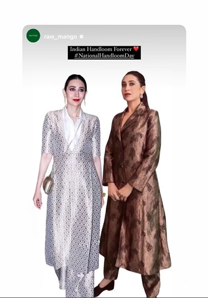 Karisma took to her Instagram stories, where she shared two pictures of herself in Indian wear and wrote: “Indian Handloom Forever #NationalHandloomDay.”