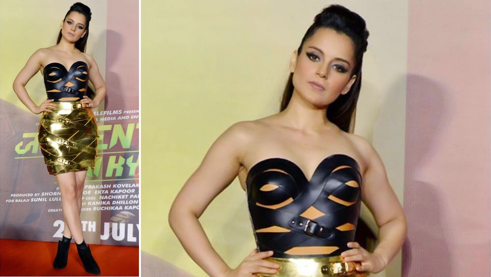 We are a tad disappointed with Kangana's pick for her trailer launch. This Marina Hoermanseder designed attire looks fine until the golden skirt comes in the picture. It's a bit loud and gaudy. Probably a simple black skirt with the similar upper bodice would have given a right effect.