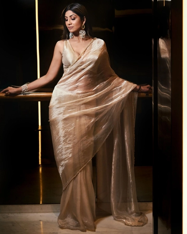 Shilpa Shetty Dazzles in Golden Saree, Glossy Lips and Smokey Eyes