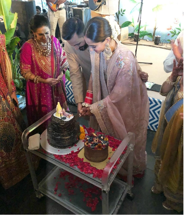 Right after the marriage ceremony took place, Sonam changed into a more comfortable outfit. She wore a pastel pink and lilac lehenga by Anamika Khanna. With heavy statement earrings, red chooda, mangalsutra, sindoor and gajra in her hair tied up in a bun, Sonam was ready to cut the wedding cake with her husband, Anand Ahuja.