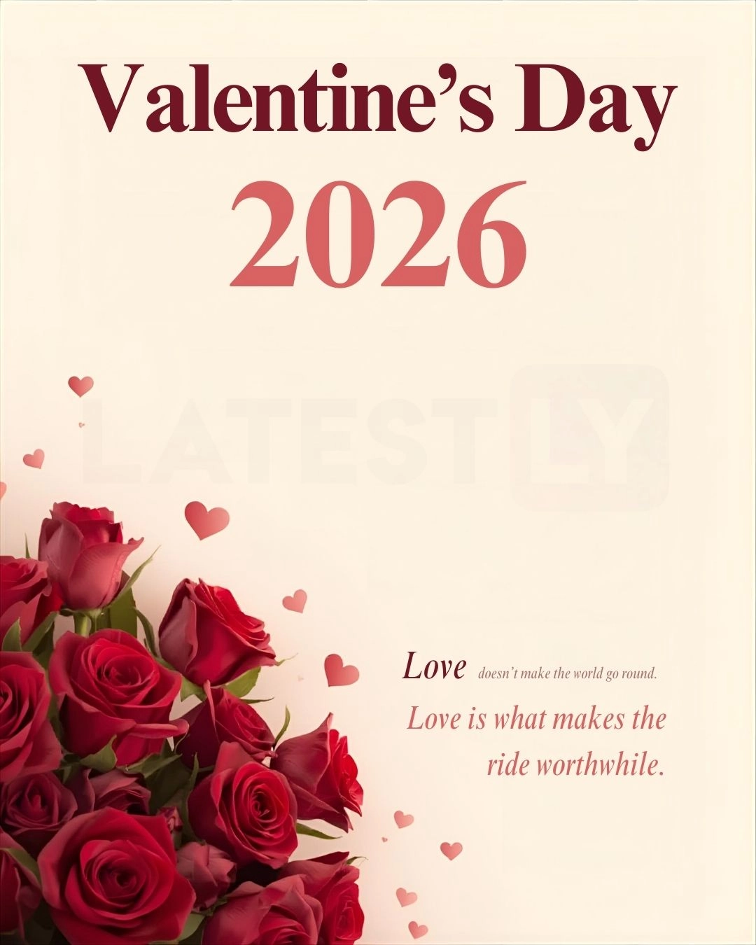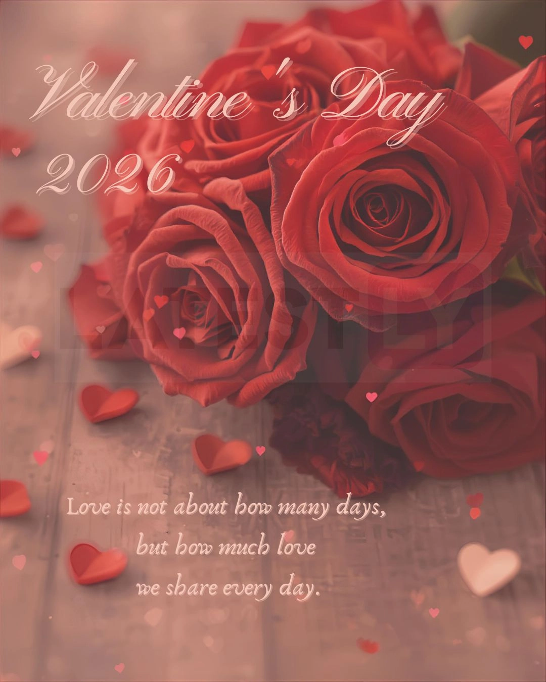 For a Classic Look: "A romantic Valentine's Day background, deep red roses, soft bokeh lighting, elegant script text 'Happy Valentine's 2026' written in gold on a cream card."