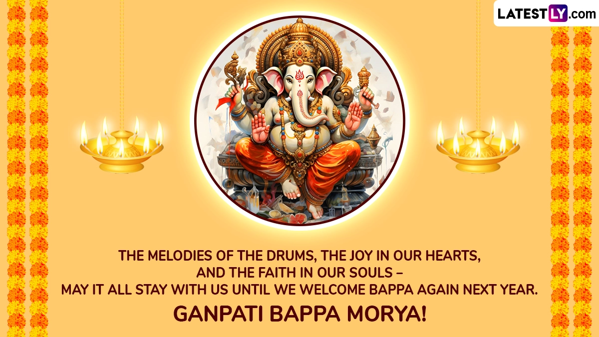 The festival is also dedicated to Lord Vishnu in his infinite form, 'Anant.' Many devotees observe a fast and tie a sacred thread, known as the 'Anant Sutra,' on their wrists as a symbol of Lord Vishnu's eternal protection. The Anant Sutra consists of 14 knots and is considered to bring prosperity and ward off misfortune when worn with devotion. In Maharashtra and other parts of India, large processions accompany the immersion of Ganesh idols, with people chanting prayers, dancing, and singing. These processions are a grand spectacle, often drawing huge crowds, and reflect the vibrant culture and community spirit. As you observe Anant Chaturdashi 2024, here are messages that you can download and share with loved ones to wish them on this day with greetings, images, wallpapers and quotes. Ananta Chaturdashi 2024 Tuesday Auspicious Timings: Can Ganesh Visarjan Be Done on Tuesday? Know Rituals, Shubh Muhurat and Other Details To Bid Farewell to Ganpati Bappa.
