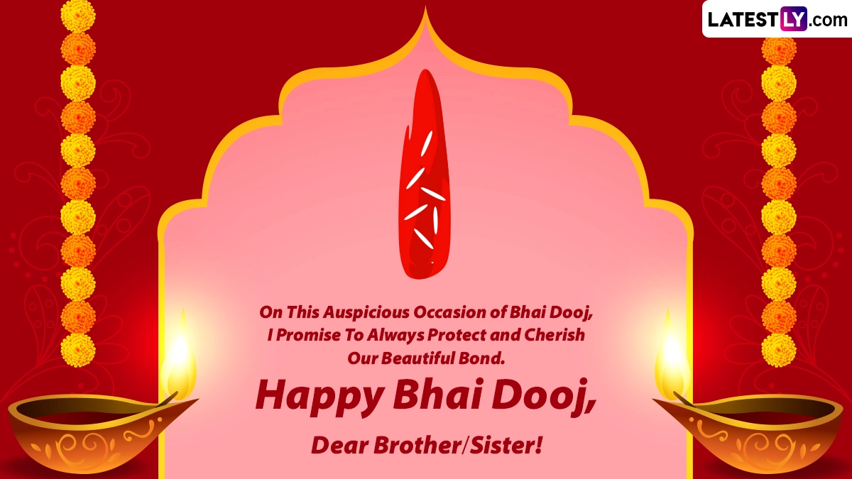 Bhai Dooj, or Bhai Phota or Bhau Beej, is a Hindu festival celebrating the bond between brothers and sisters. It is observed on the second day after Diwali, the festival of lights, and usually falls on the Dwitiya Tithi (second day) of the Kartik month in the Hindu calendar, corresponding to October or November in the Gregorian calendar. Bhai Dooj 2023 will be observed on Wednesday, November 15. The festival holds cultural and emotional significance, emphasising siblings' strong and special relationship. The name "Bhai Dooj" itself translates to "Bhai", meaning "brother," and "Dooj", meaning "the second day after the new moon." As you celebrate Bhai Dooj 2023, we at LatestLY have brought together a collection of messages you can download and send to all your beloved siblings to wish them on this day with WhatsApp stickers, GIF Images, HD wallpapers and SMS.