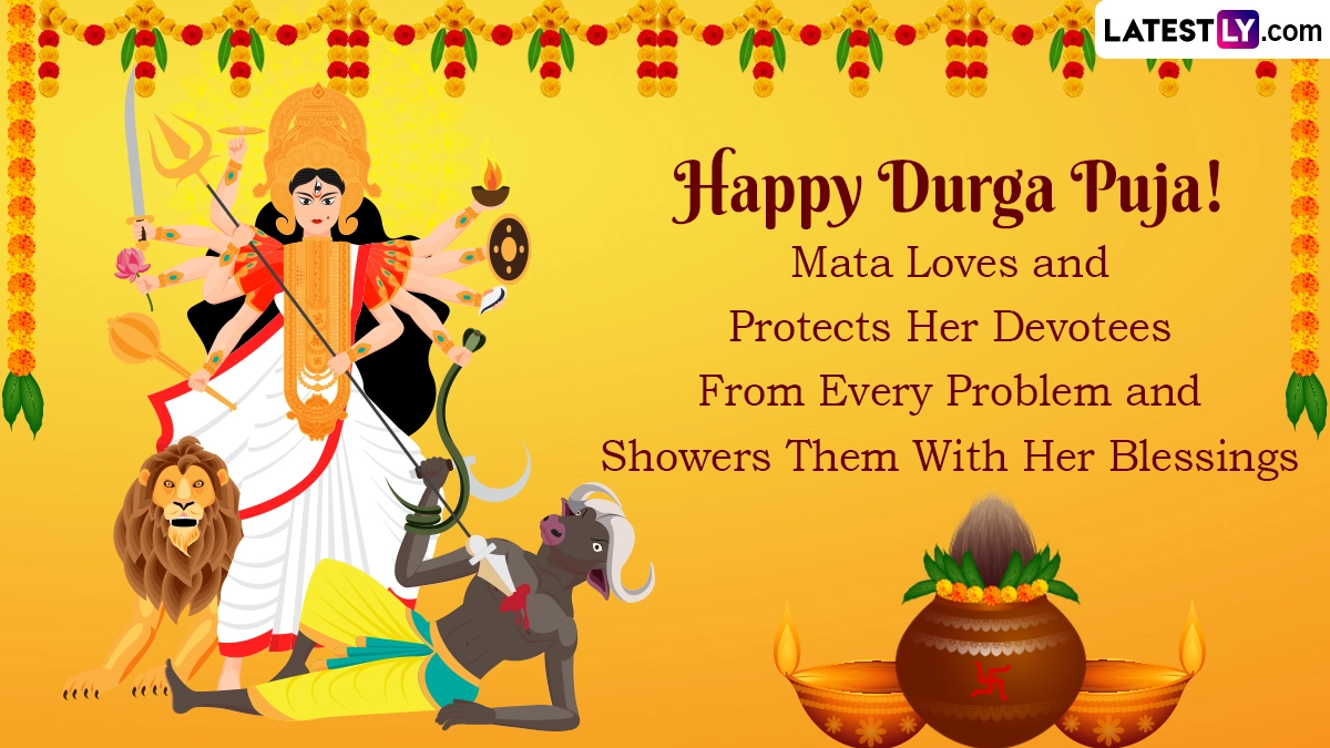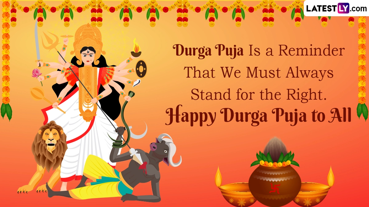 Durga Puja is one of the most significant festivals celebrated with grandeur, devotion, and joy, particularly in West Bengal and other parts of India. The auspicious festival is dedicated to Maa Durga, who symbolises the victory of good over evil. The whole of West Bengal, especially the city of Kolkata, comes alive with lights, pandals and cultural festivities. The main festivity takes place for five days, ending on Dashami, where Maa Durga is immersed in the river, marking her return to her celestial abode. Durga Puja 2024 starts on October 8 with Maha Panchami and ends on October 13, that is, Bijoya Dashami. Devotees across exchange heartfelt Durga Puja 2024 wishes and greetings to spread the festive cheer. This is why we bring you a collection of Happy Durga Puja 2024 wishes, Durga Puja 2024 images, Happy Durga Puja messages, greetings, quotes and SMS to share with your family and friends.