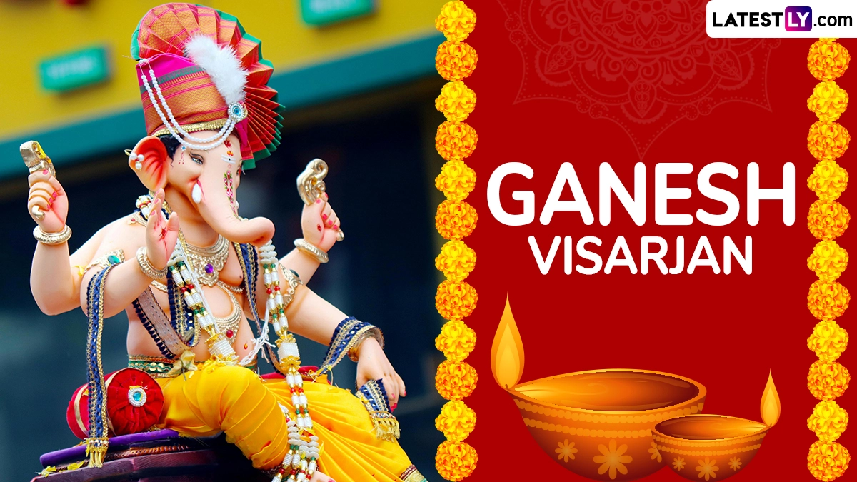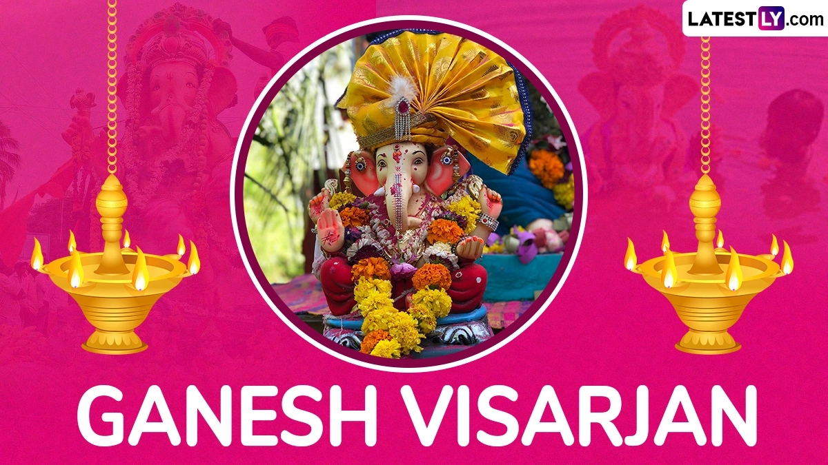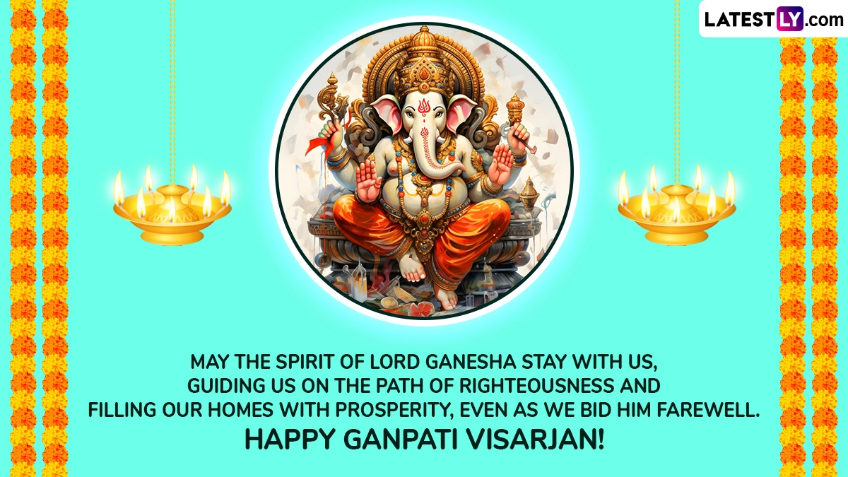 Anant Chaturtdashi will be observed on Tuesday, September 17. It is celebrated as the final day of Ganesh Visarjan, marking the end of ten-day-long Ganeshotsav celebrations. This event, which typically takes place on the 10th day after Ganesh Chaturthi, involves the immersion of Ganesh idols in water bodies, symbolising the deity's return to his divine abode. However, Ganesh Visarjan does not necessarily only take after 10 days. People mostly keep the Ganpati Bappa idol at home and do Ganesh Visarjan after 1.5 days, 3 days, 5 days and 7 days. The festival is celebrated with great fervour across India, particularly in Maharashtra, where the processions are especially grand and colourful. As you observe Ganesh Visarjan 2024, we at LatestLY have brought together a collection of Happy Ganesh Visarjan 2024 messages, images and "Ganpati Bappa Morya Agle Baras Tu Jaldi Aa" slogans that you can download and share with one and all to wish them on this day.