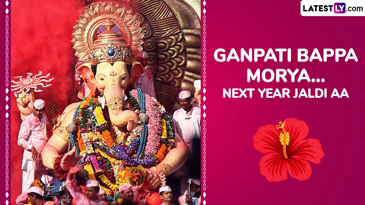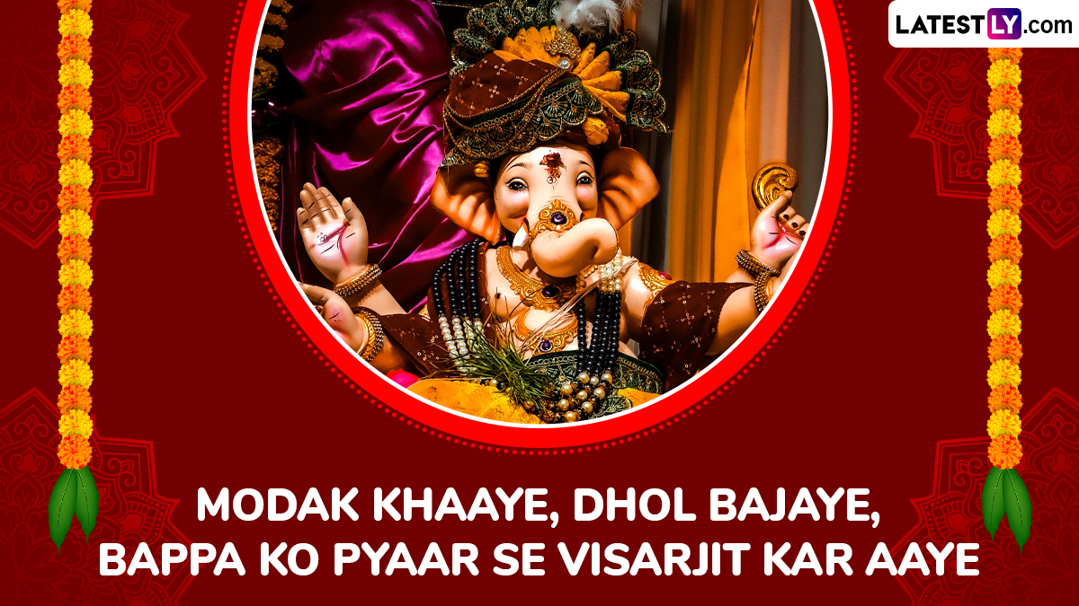 Ganesh Visarjan, also known as Anant Chaturdashi, is a moment filled with mixed emotions for devotees of Lord Ganesha, as it is the day people bid farewell to Bappa. The Visarjan day brings a sense of separation, as after days of worship, prayers, and treating Ganpati Bappa like a family member, this moment feels emotional and heavy-hearted. This year, the 10-day Ganesh Visarjan, i.e., Anant Chaturdashi day, falls on Saturday, September 6, 2025. If you are looking for some funny and light-hearted Ganpati slogans and sayings, here’s a list of wishes and messages that devotees can chant and bid goodbye to Ganpati Bappa. You can send these WhatsApp messages, Ganpati Bappa Morya images, Ganpati HD wallpapers, and Facebook status to your friends and family and celebrate the Ganesh Chaturthi festival. Ganesh Visarjan 2025 Dates: Here Are the Important Timings and Shubh Muhurat for 1.5, 3, 5 & 7-Day Ganpati Immersions Till Anant Chaturdashi To Bid Farewell to Ganpati Bappa.