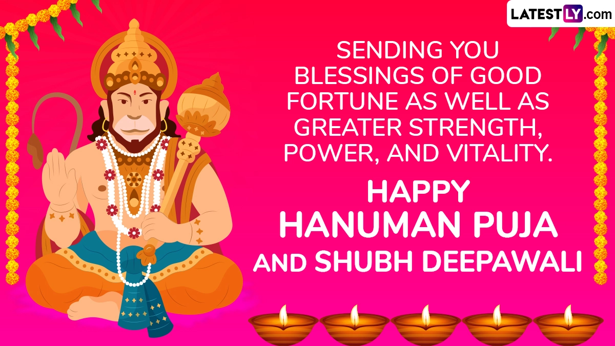 Hanuman Puja 2024 falls on Wednesday, October 30, during the Diwali 2024 week. It is a revered Hindu festival celebrating Lord Hanuman, the powerful and devoted follower of Lord Rama. Born to Mata Anjani and Kesari, with the blessings of Lord Shiva, Hanuman is admired for his incredible strength, loyalty, and courage. Observed with great devotion, Hanuman Puja is marked by prayers, fasting, and rituals aimed at invoking his blessings for protection, strength, and devotion. To celebrate Hanuman Puja 2024, share these Hanuman Puja 2024 wishes, HD images, WhatsApp messages, greetings, wallpapers, quotes and Lord Hanuman photos to celebrate during the Diwali festival. Deepavali Hanuman Puja 2024 Wishes: Send WhatsApp Messages, Greetings, Images and Wallpapers To Celebrate Diwali Festival.