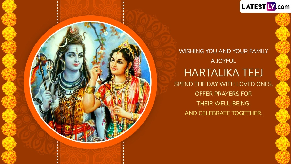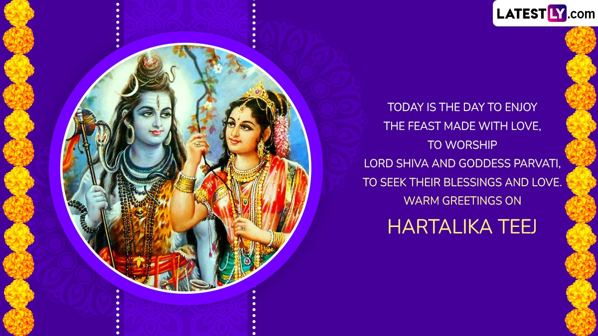 Hartalika Teej 2024 will be observed on Friday, Saturday 6. It is a prominent Hindu festival celebrated predominantly in the Indian states of Rajasthan, Uttar Pradesh, and Bihar, as well as in Nepal. It is observed in honour of Goddess Parvati and is known for its significance in the lives of married and unmarried women. Falling on the third day of the Shukla Paksha (waxing phase of the moon) in the month of Bhadrapada (August-September), Hartalika Teej is marked by rituals that reflect deep devotion and commitment to marital harmony and well-being. To celebrate the festival of Hartalika Teej, we bring you Happy Hartalika Teej 2024 greetings and HD images that you can share with WhatsApp messages, wallpapers and quotes to wish your friends and family Happy Hartalika Teej.