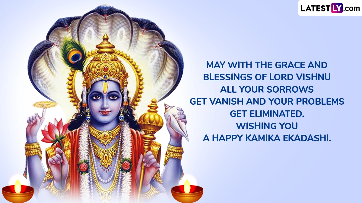 On Kamika Ekadashi, devotees wake up before sunrise and perform rituals including sacred bathing, lighting diyas, chanting Vishnu’s names, and engaging in bhajan-kirtan. The fast is observed strictly; devotees avoid grains, lentils, and other tamasic foods. Some even choose to go without water, observing the Nirjala vrat. Staying awake all night and reciting scriptures such as the Bhagavad Gita or Vishnu Purana is considered highly meritorious on this day. As you observe Kamika Ekadashi 2025, share these Happy Kamika Ekadashi 2025 messages, greetings, quotes, wishes, HD images of Lord Vishnu and wallpapers.