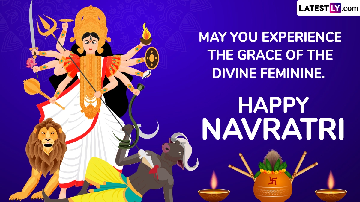 Sharad Navratri, one of the most significant festivals in the Hindu calendar, is celebrated with immense fervour and devotion across India and by Hindu communities worldwide. Typically occurring in September or October, this nine-night festival honours Goddess Durga and her nine avatars, known collectively as Navadurga. Sharad Navratri 2024 starts on October 3 and ends on October 11. Each day of Navratri is dedicated to a different aspect of the Goddess, celebrating her virtues and strength while symbolising the triumph of good over evil. On this day, share Happy Navratri 2024 wishes, greetings and HD wallpapers. 9 Forms of Maa Durga To Worship During Navratri 2024: Know Navadurga Names and Download Images and HD Wallpapers of Nine Avatars of Goddess Durga for Free Online.