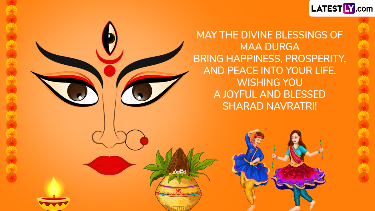 Navratri is one of the important festivals in India and holds great spiritual importance across the country. The festival is dedicated to Goddess Durga and her nine divine forms. It lasts for nine days, where devotees engage in devotion, fasting, prayers, and celebrations. Each day is associated with a different form of the Goddess. This year, Sharad Navratri 2025 starts on September 22 with Ghatasthapana and ends on October 2, on the Vijayadashami day. As we celebrate the Navratri 2025, we at LatestLY, have compiled a collection of Happy Navratri 2025 wishes, Navratri 2025 greetings, Navratri 2025 HD wallpapers, Navratri 2025 Facebook status, Navratri 2025 pics which you can download and share with your family, friends and relatives. You can also download these Navratri 2025 wishes and slogans and send them to your loved ones as Happy Navratri 2025 greetings. How India Celebrates Sharad Navratri: From Garba in Gujarat to Durga Puja in Bengal, Golu in Tamil Nadu and Bathukamma in Telangana.