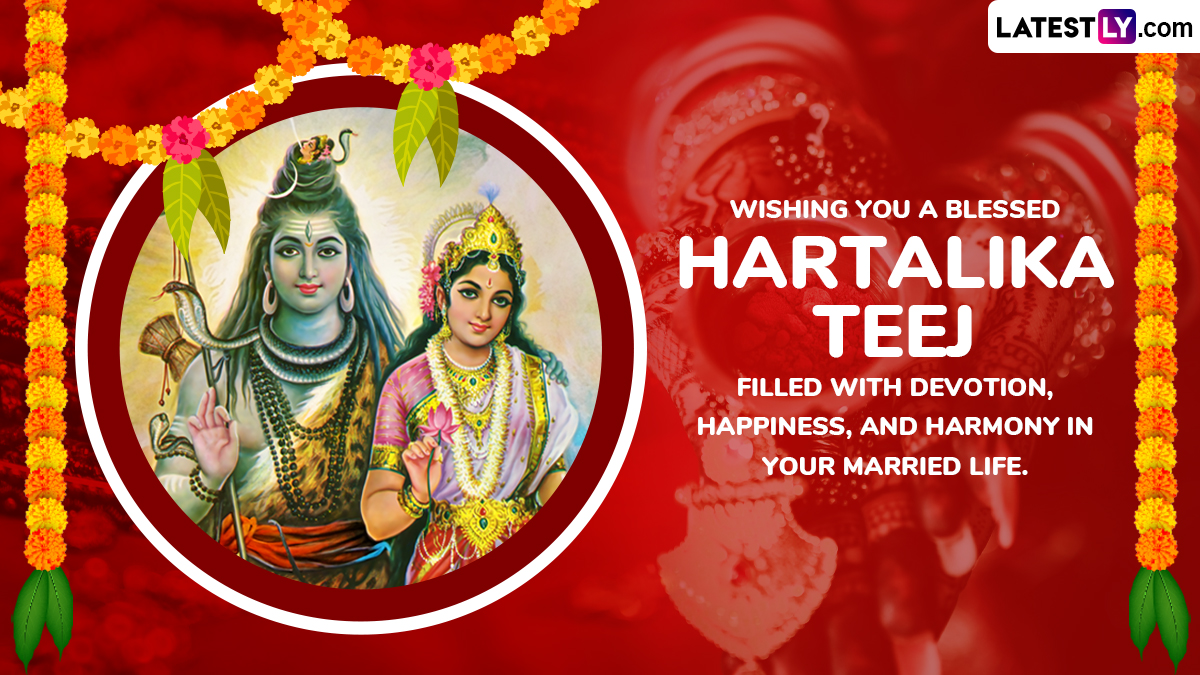 Hartalika Teej 2025 will be observed on Tuesday, August 26. It is a sacred festival observed predominantly by women in Northern and Western India, particularly in states like Rajasthan, Uttar Pradesh, Bihar, and Maharashtra. It falls on the Tritiya (third day) of the Shukla Paksha in the Bhadrapada month (August–September). To make your celebrations more special, explore our handpicked Hartalika Teej images, Hartalika Teej 2025 greetings, festive pack stickers, and Hartalika Teej messages, perfect for WhatsApp, Facebook and beyond. From vibrant wallpapers to heartfelt Happy Teej greetings, here’s a collection of the best Hartalika Teej wishes and images you can share with loved ones. Hartalika Teej 2025 Date and Time: Know Timings, Significance and Celebrations of the Divine Union of Lord Shiva and Goddess Parvati.