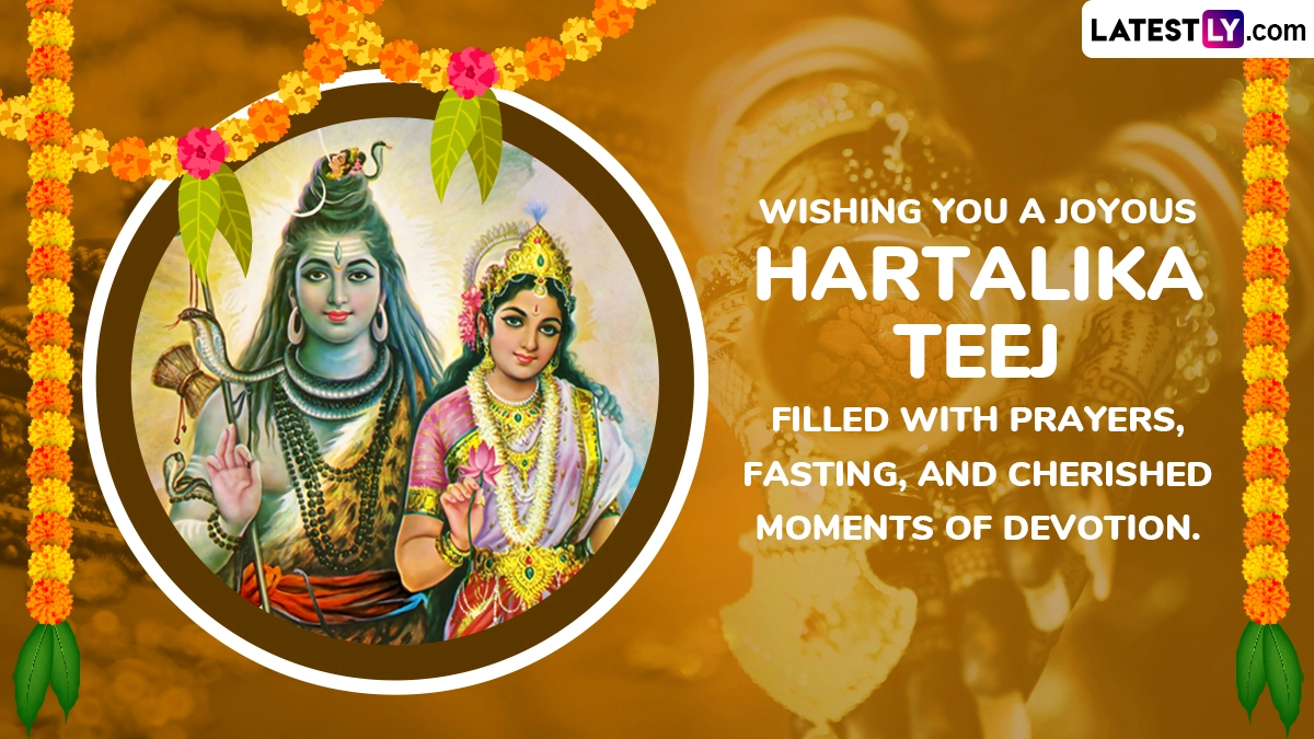 The day begins with women adorning themselves in bright sarees, applying mehndi, and wearing traditional jewellery. They perform the Hartalika Teej puja by crafting idols of Shiva and Parvati from clay or sand, decorating them with flowers, and offering bilva leaves, fruits, and sweets. The puja is followed by group singing traditional Teej songs and the narration of the Hartalika Katha. As you observe Hartalika Teej 2025, we at LatestLY have brought together a collection of messages you can download and share with your friends and family to wish them on this day with WhatsApp stickers, images, HD wallpapers and SMS.