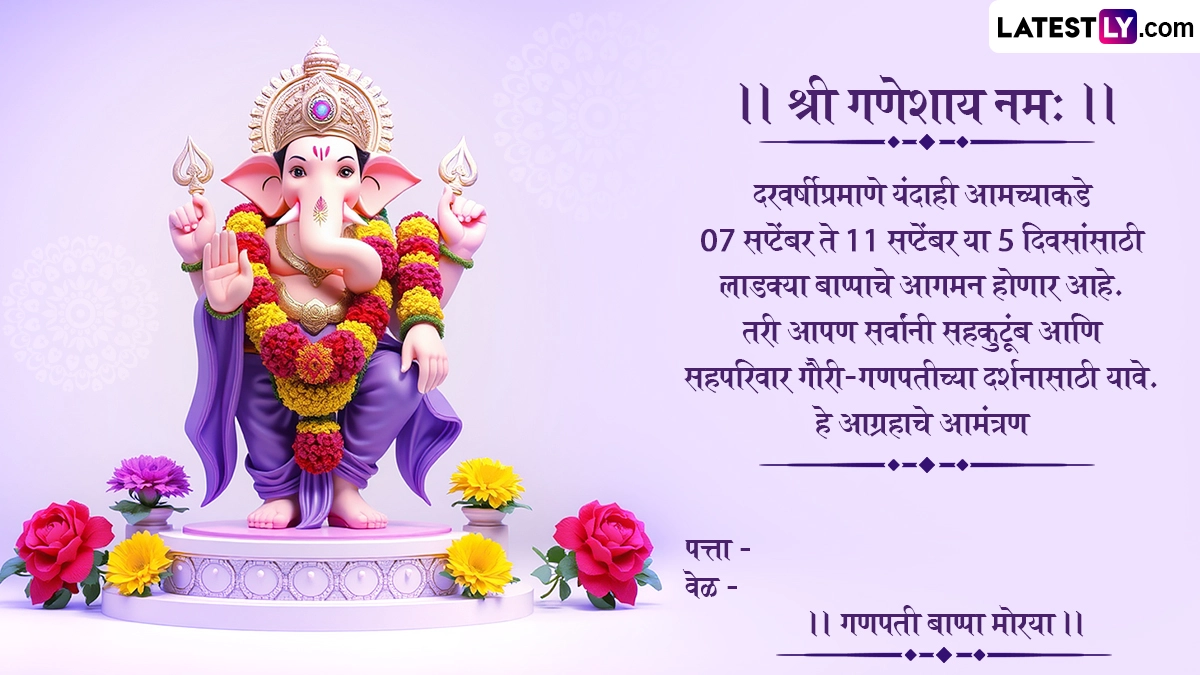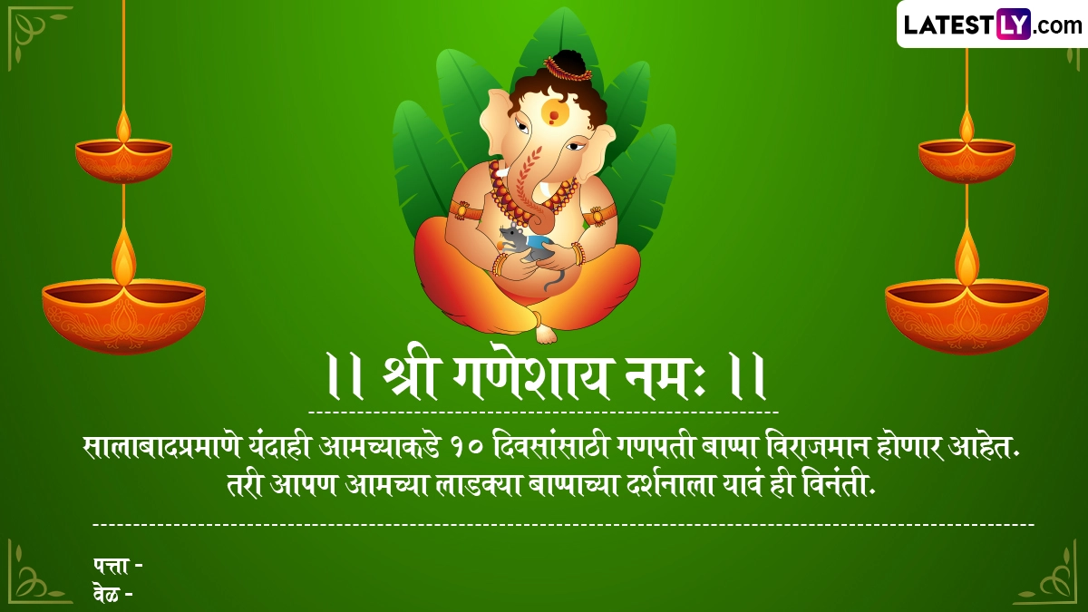 The festival is usually spread across 10 days and people make it a point to remember and celebrate Lord Ganehsa and all his stories during this time. As we prepare to celebrate Ganesh Chaturthi 2024, here are some Chaturthi 2024 Invitation card templates, Ganesh Chaturthi greetings, Ganapati Chaturthi 2024 invite designs that you can share with family and friends to prepare for this festive occasion. Ganesh Chaturthi 2024 Messages in Marathi: Share Vinayaka Chaturthi Greetings, WhatsApp Status, Ganpati Bappa HD Images and Wallpapers To Celebrate the Festival.