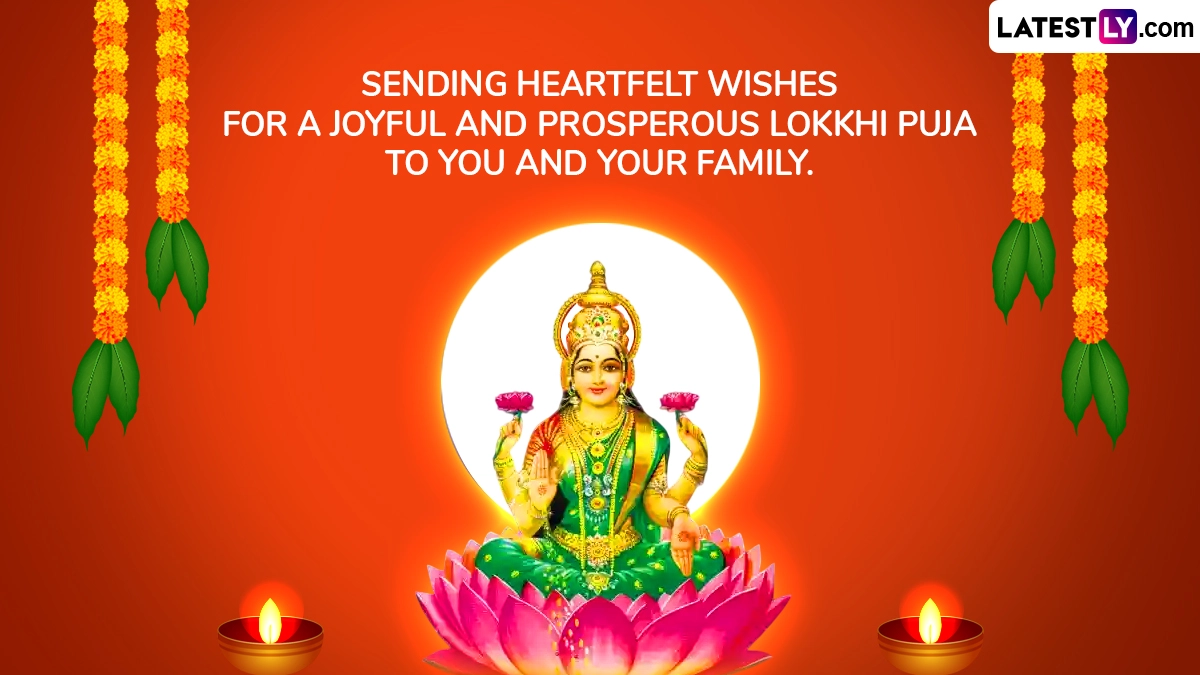 The celebration of Lokkhi Puja or Bengali Lakshmi Puja revolves around the story of Goddess Lakshmi’s visit to earth on the occasion of Ashvin Purnima. It is believed that Goddess Lakshmi visited devotees who stayed away through the night, awaiting her, and blessed them with prosperity and wealth. As we prepare to celebrate Lokkhi Puja 2025, here are some Happy Lokkhi Puja 2025 wishes and messages, Bengali Lakshmi Puja greetings, Lokkhi Puja images and wallpapers, Happy Bengali Lakshmi Puja WhatsApp stickers and Happy Lokkhi Puja Facebook status pictures that you can post online. Kojagara Puja 2025 Greetings: Send Kojagari Lakshmi Puja Wishes, Subho Lokkhi Pujo Messages, Goddess Lakshmi HD Images and Wallpapers on Sharad Purnima.