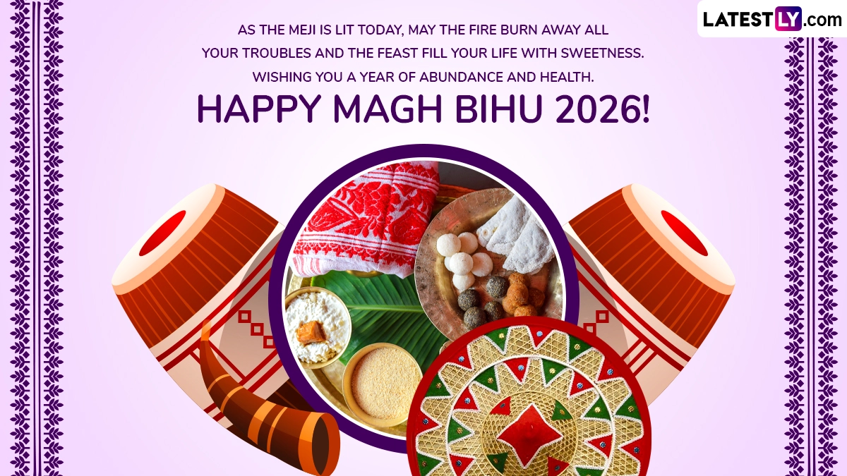 The state of Assam has begun its vibrant harvest celebrations for Magh Bihu 2026, also known as Bhogali Bihu, Bhogali and Maghar Domahi. While the primary festival day is observed today, Thursday, January 15, festivities commenced earlier this week with community gatherings and ritual preparations. Marking the end of the winter harvest and the transition of the Sun into Capricorn, the festival is a time of fulfillment, characterized by communal feasting and the symbolic lighting of ritual bonfires. Scroll down to get some of the best Happy Magh Bihu 2026 wishes and greetings, Happy Bhogali Bihu messages, images and wallpapers to share.