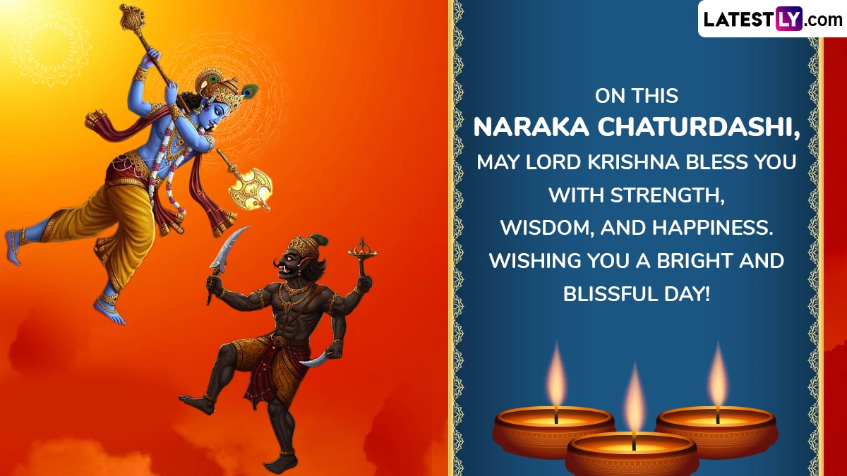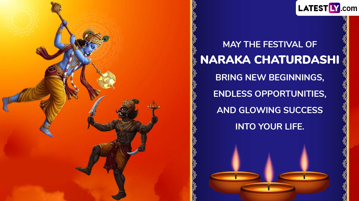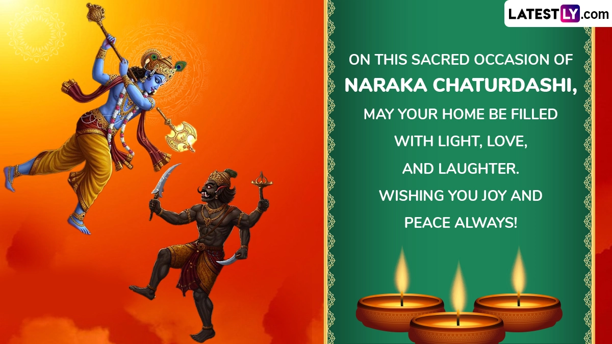 Narak Chaturdashi, also known as Choti Diwali, is celebrated with great fervour and devotion across India. This auspicious day falls before Diwali and holds great spiritual and cultural importance in India. It marks the victory of Lord Krishna over the demon Narakasura, symbolising the triumph of light over darkness and good over evil. This year, Narak Chaturdashi is on Monday, October 20, 2025. On this day, one of the important rituals is to take the holy bath, called as the Abhyanga Snan. On the occasion of Narak Chaturdashi 2025, we at LatestLY have curated special Diwali greetings and messages for you, to send to everyone on this auspicious day. If you are looking online for Narak Chaturdashi 2025 wishes, Choti Diwali messages, Choti Diwali greetings, Naraka Chaturdashi HD wallpapers, Choti Diwali pics, Narak Chaturdashi WhatsApp Stickers and SMS, we have it all here. Happy Choti Diwali 2025 Wishes, Messages and Images: Share Happy Naraka Chaturdashi Greetings, SMS, Happy Diwali HD Wallpapers With Family and Friends.