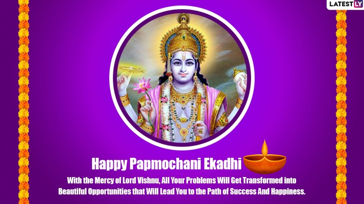 Papmochani Ekadashi is an important religious observance for Hindus worldwide. Ekadashi, which translates to the 11th day of the lunar cycle, occurs twice monthly in the Hindu calendar. Papmochani Ekadashi takes place during the Shukla Paksha (the waxing phase) of the Chaitra month and holds a special place in Hinduism due to its connection with spiritual purification and seeking the blessings of Lord Vishnu. Papmochani Ekadashi 2025 is believed to offer devotees the opportunity to be absolved of their sins and receive divine grace, leading to personal growth, peace and prosperity. Papmochani Ekadashi's importance is explained in the Padma Purana, a revered Hindu scripture that describes the benefits of fasting and devotion on this day. According to myth, the demon Mura, who was causing chaos in the world, was defeated by Lord Vishnu. This victory symbolises the triumph of good over evil and is commemorated on Papmochani Ekadashi. On Papmochani Ekadashi 2025, we bring you Papmochani Ekadashi 2025 wishes, greetings, HD images of Lord Vishnu, messages, quotes and wallpapers to celebrate the Ekadashi, ahead of Chaitra Navratri. When Is Papmochani Ekadashi 2025? Know Date, Tithi Timings, Parana Time and Significance of the Auspicious Day Dedicated to Lord Vishnu.