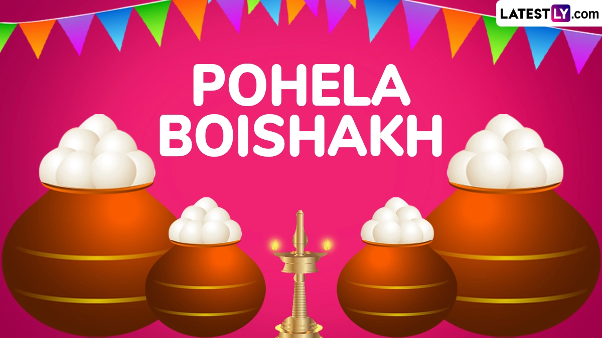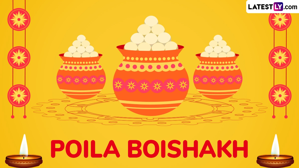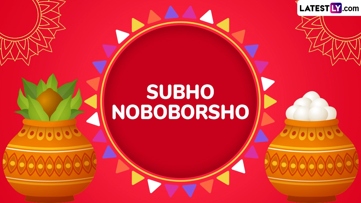 Pohela Boishakh begins with cultural processions, music, and early morning gatherings, such as the iconic “Mangal Shobhajatra” in Dhaka. People dress in traditional attire, often in red and white, and greet each other with "Shubho Noboborsho," which means “Happy New Year.” Households are cleaned, businesses open new ledgers (Haal Khata), and families enjoy elaborate feasts featuring Bengali delicacies like panta bhat, hilsa fish, and sweets. As you celebrate Pohela Boishakh 2025, we at LatestLY have compiled a collection of messages that you can download and share with your friends and family to wish them on this day with WhatsApp stickers, images, HD wallpapers and SMS.