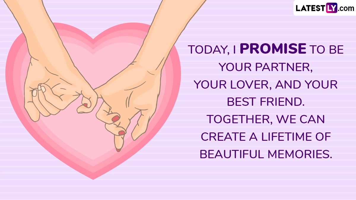 For couples, Promise Day is an opportunity to reflect on the depth of their connection and make vows that will enhance their relationship. These promises are not just about grand gestures but are often about the everyday acts of love and support that ensure a relationship stays strong. It’s a chance to express your feelings and to assure each other that no matter what challenges may come, you’ll always have each other’s back. As you celebrate Promise Day 2025, we at LatestLY have curated a collection of messages that you can download and share with your girlfriend and boyfriend to wish them on this day with wishes, greetings, images, quotes, messages, HD wallpapers, and SMS. Happy Promise Day 2025 Greetings and Romantic Quotes: WhatsApp Status, Images, HD Wallpapers and SMS To Share With Your Loved Ones on Valentine Week Day 5.