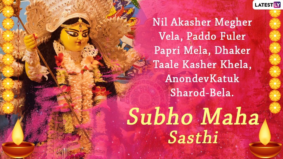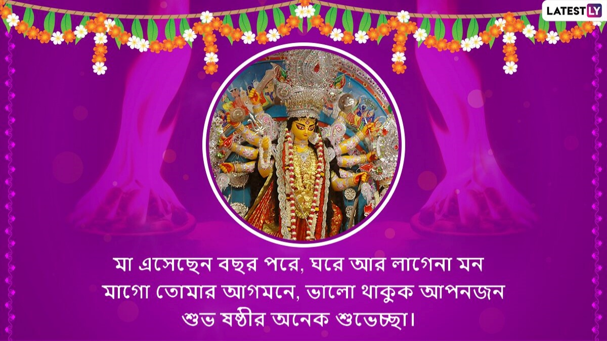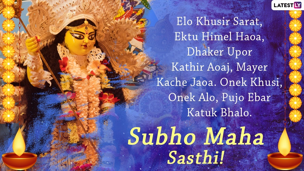 Subho Shashti marks the sixth day of Durga Puja, a significant day when devotees welcome Goddess Durga and her children to their earthly abode. The festivities start with rituals such as 'Bodhon,' symbolising the invocation of the goddess. On this day, vibrant pandals are set up, the air fills with the scent of incense, and traditional drumbeats (dhak) resonate as people gather in their best attire to celebrate the arrival of the divine mother. Subho Shashti 2024 is on October 9. Sharing Bengali wishes on Subho Shashti is a beautiful way to convey your blessings and good wishes to loved ones. Hence, we bring you Subho Shashti 2024 wishes in Bengali that you can download for free online. These Maha Shashti images, Maa Durga HD wallpapers, Happy Durga Puja greetings, quotes and messages are perfect to share on the first day of Pujo.