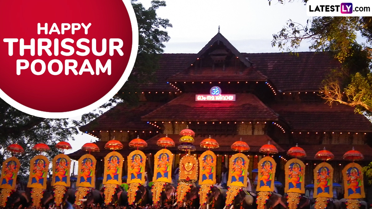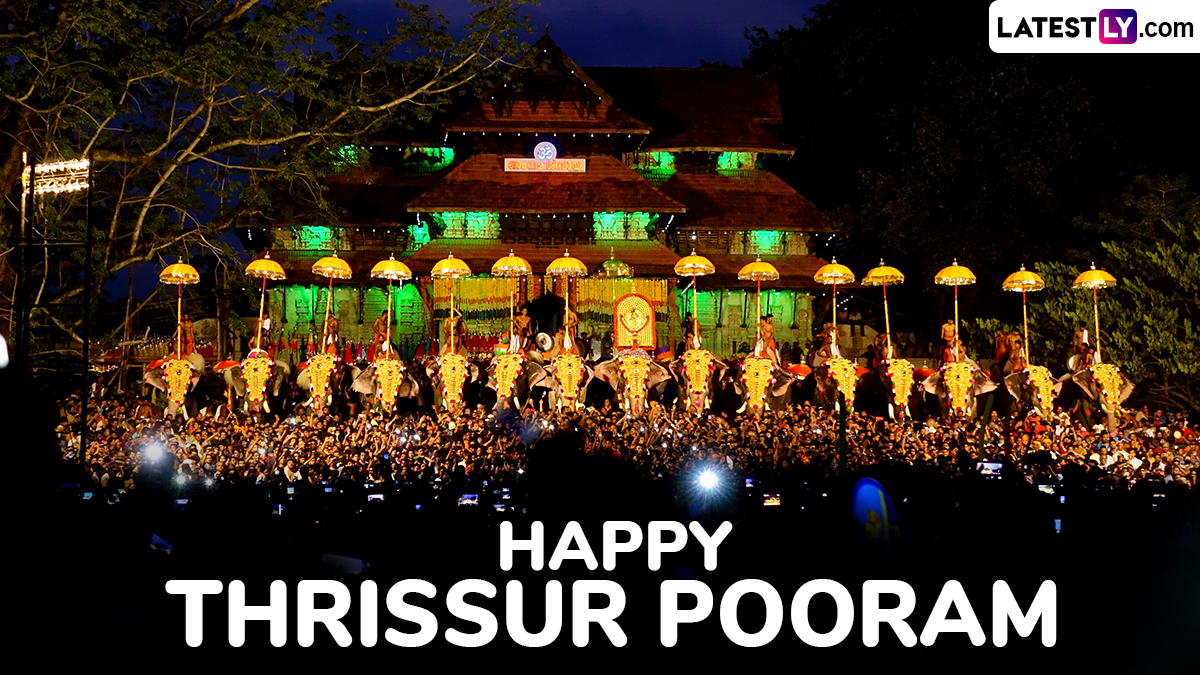 Thrissur Pooram 2025 falls on Wednesday, May 7. Celebrated in the cultural capital of Kerala, it is one of the most vibrant and grand temple festivals in India. Held annually in the Malayalam month of Medam (April-May), it centres around the Vadakkunnathan Temple in Thrissur. The festival was introduced by Raja Rama Varma (Sakthan Thampuran) in the late 18th century to unite various temples in the region into a grand celebration. Today, it is a symbol of Kerala’s rich cultural and spiritual heritage, attracting thousands of visitors from across the country and abroad. The defining feature of Thrissur Pooram is its majestic elephant processions, synchronised drum performances (Melam), and spectacular fireworks. To celebrate the vibrant temple festival of India on May 7, we bring you Thrissur Pooram 2025 greetings, messages, quotes, wishes, images and HD wallpapers.