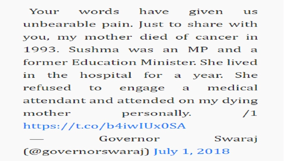 Recently, when Swaraj was trolled on Twitter, her husband came to her rescue. In a bid to shame the troll, identified as Mukesh Gupta (@MG_IITDelhi), Kaushal shared the screenshot of the message he received on social media. "Your words have given us unbearable pain… Please do not use such words for her," he said.