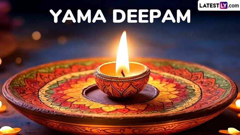 Yama Deepam is a significant ritual observed during the festival of Diwali, especially in South India. Yama Deepam 2025 falls on Saturday, October 18, 2025. This annual occasion is a day to worship and seek the blessings of the Lord of death - Lord Yamaraj, Lord Kuber, Goddess Lakshmi, and Lord Dhanavantari. On this day, a deep or diya is lit outside the house in honour of Lord Yama, known as Deepdan for Yamraj. To celebrate Yama Deepam 2025, we have curated a list of Yama Deepam wishes that you can share with your family and friends. People can celebrate this day by sharing Happy Yama Deepam 2025 wishes and messages, Yama Deepam greetings, Happy Dhanteras images and wallpapers, Dhantrayodashi pictures with your loved ones. Diwali 2025 5 Days Dates in India Calendar: When Is Dhanteras, Naraka Chaturdashi, Lakshmi Puja and Bhai Dooj?