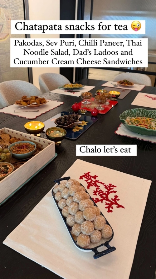 “Chatpatta Snacks for tea. Pakodas, sev puri, chilli paneer, Thai noodle salad, dad’s laddoos and cucumber cream cheese sandwich. Chalo let’s eat,” she wrote.